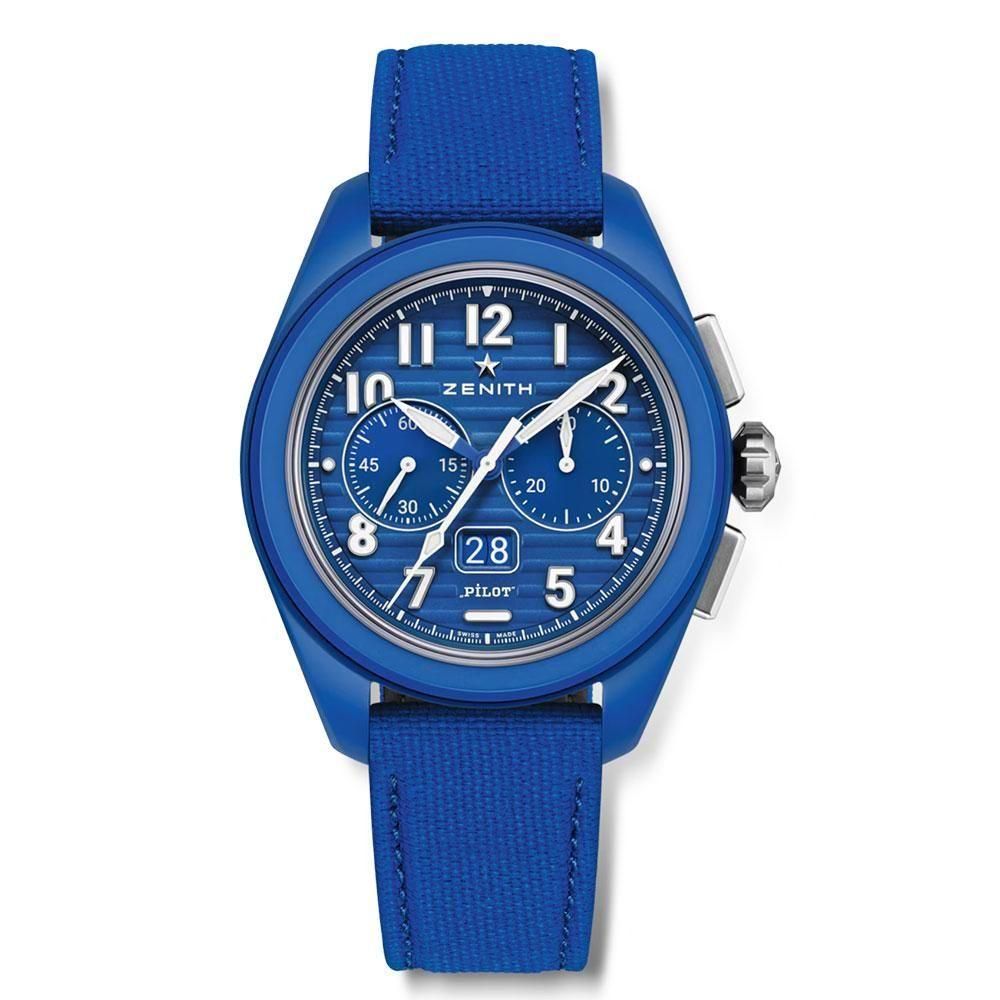 ゼニスのパイロット クロノグラフをワントーンで仕上げたブルーモデル。ブルーセラミック製42.5mmケース、チタン製リューズ、チタン製プッシュボタン、波型のブルー文字盤、スーパールミノバを塗布した大型のアラビア数字を備えています。ビッグデイトとフライバック機能を備える高振動自動巻クロノグラフ キャリバー エル・プリメロ 3652を搭載。ストラップチェンジシステムにより簡単に交換できるブルーとホワイトのコーデュラ・エフェクト ラバーストラップが付属します。ゼニス160周年を祝う160本限定のスペシャルエディション