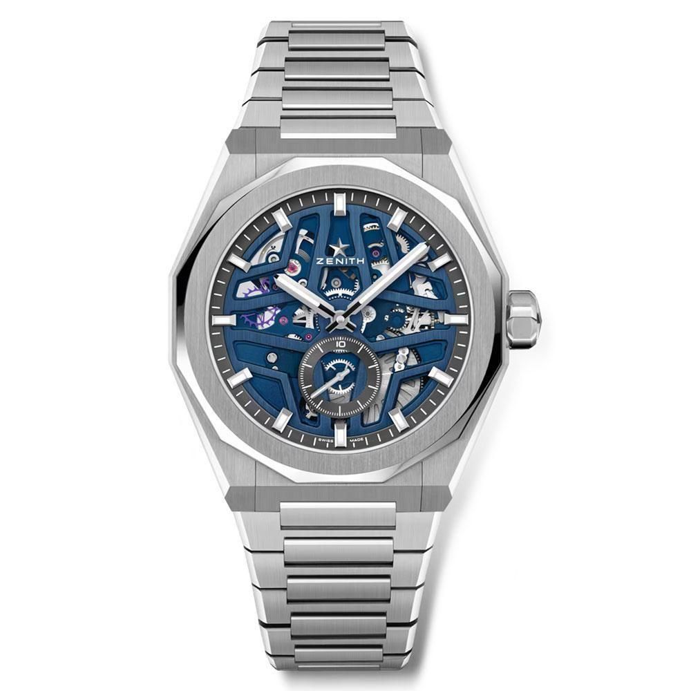八角形の41mmスチールケースに、ファセットカットのベゼルを配した「デファイ スカイライン スケルトン」。ブルーのオープン文字盤に、ゼニスの象徴である4つの点を結んだ星があしらわれています。世界初の1/10秒精度を誇るインジケーターを備えた自社製高振動自動巻スケルトンムーブメント エル・プリメロ 3620 SKを搭載。スチールブレスレットとブルーラバーストラップが付属し、ストラップ交換システムを存分にお楽しみいただけます。